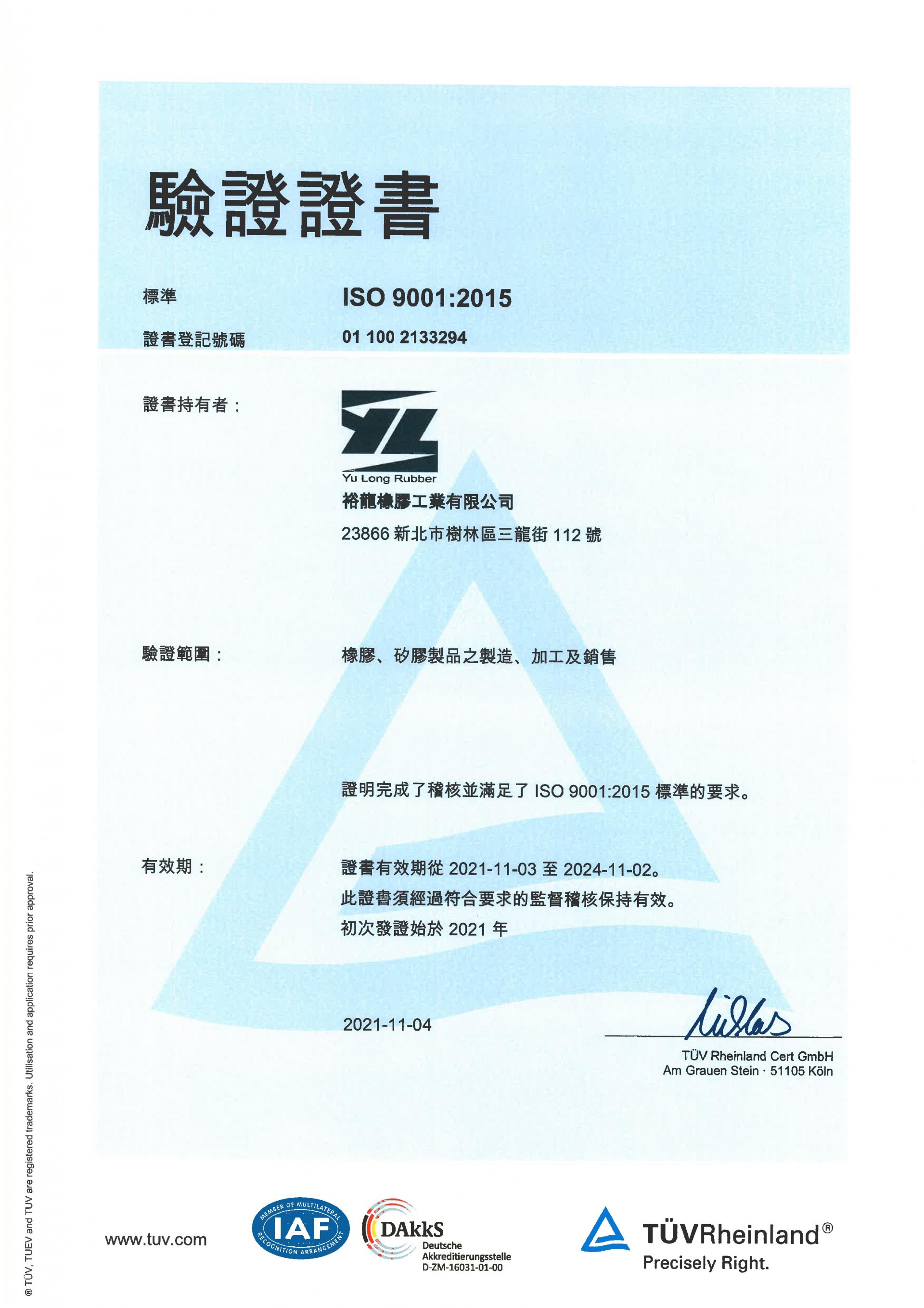 感謝您對裕龍的支持,裕龍全體夥伴秉著「品質第一是責任,客戶滿意是榮譽」持續前進,於2021年通過德國萊因(TÜV Rheinland) ISO-9001:2015認證,我們將確實落實ISO-9001之精神原則,持續提升各項產品品質及要求,致力於提供客戶各式矽橡膠製品完整解決方案,將服務走在製造前端,始終相信客戶服務為產品的核心價值。
